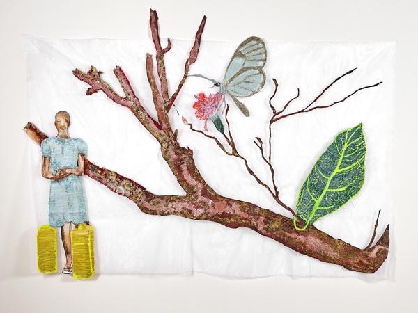 Ana Silva, Guardiãs 028, 2025, ricami, paillettes, pigmenti naturali e stampa su crinolina, 154 x 244 cm. Courtesy Ana Silva and A Gentil Carioca, Rio de Janeiro