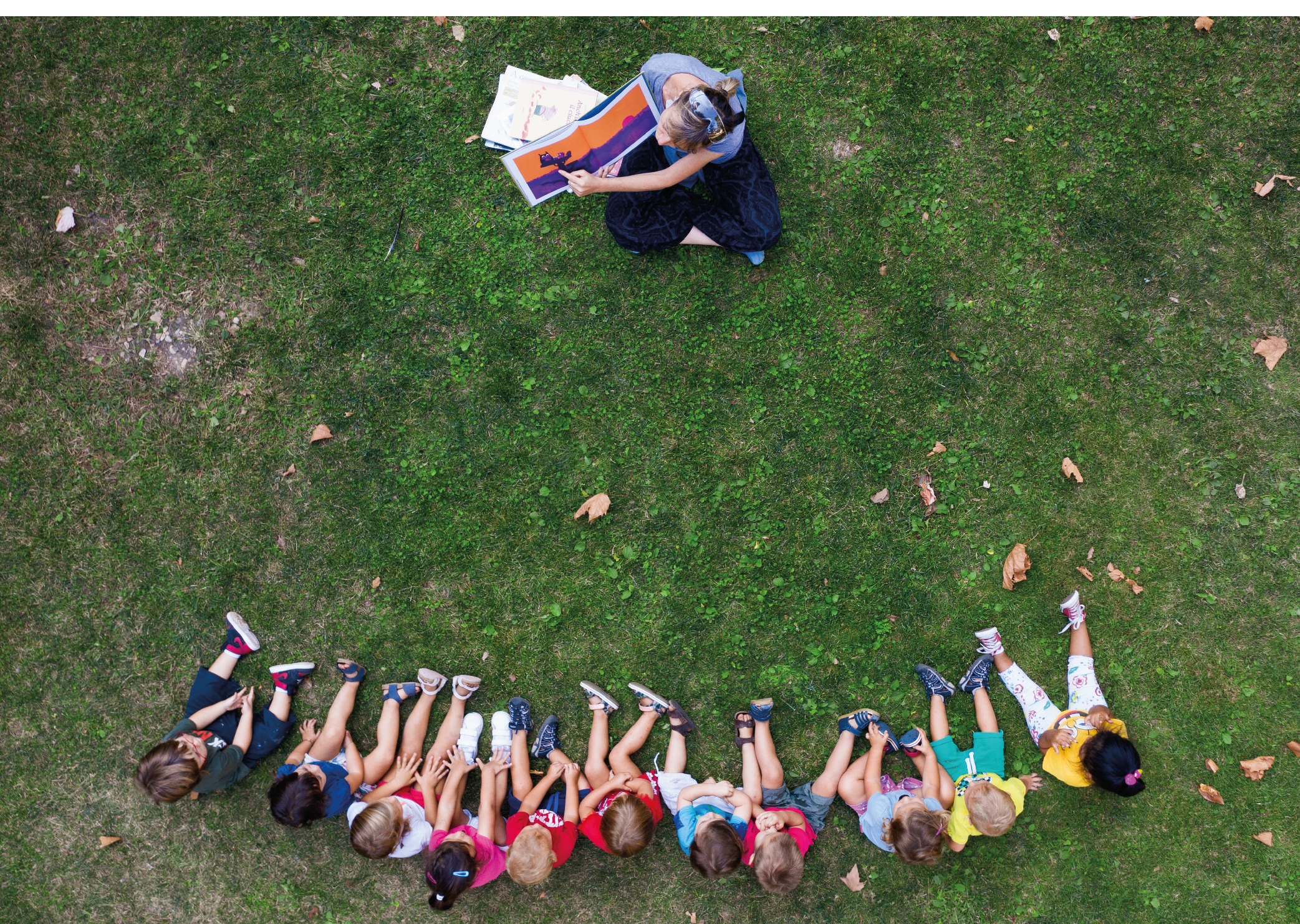 Bambini seduti su un prato verde, uno vicino all'altro come non accadeva da mesi, intenti ad ascoltare una storia letta dall’educatrice. Viste d... -