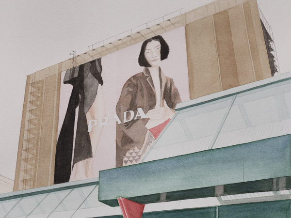 In Ritratti, agli alberi si sostituiscono i grandi cartelloni pubblicitari. La centralità del volto, la sovrapproduzione di immagini e il dominio dell’immaginario commerciale definiscono un paesaggio urbano segnato dall’iperpresente e dall’effimero. I volti femminili delle campagne di moda, i loghi e la grafica pubblicitaria interagiscono casualmente con porzioni di facciate, in viste oblique e prospettive instabili, attraversate dai fili dell’illuminazione urbana. Il disegno restituisce complessità e profondità a un ambiente visivo saturo, trasformando l’immagine pubblicitaria in una visione stratificata.