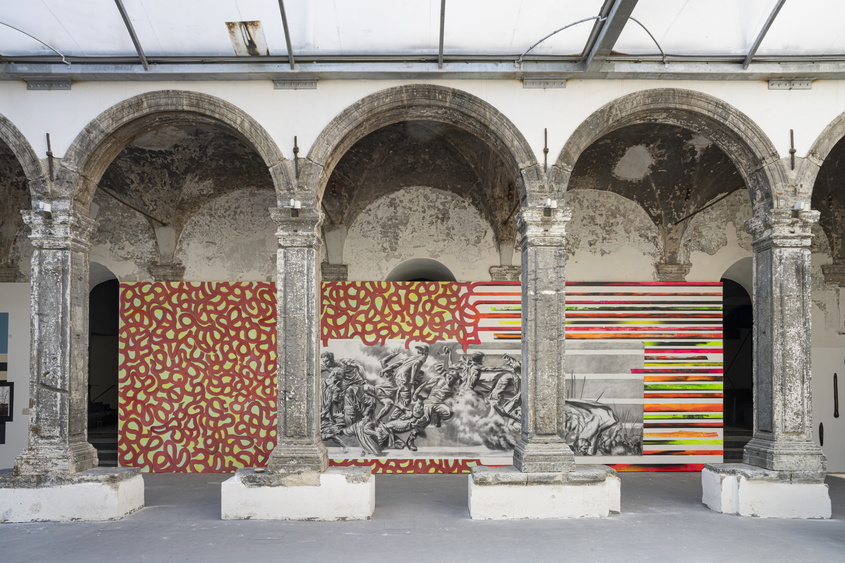 Installazioni site specific, ma anche tele e sculture, realizzate per interagire tra loro e con la struttura rinascimentale del Chiostro di Santa Cate... -