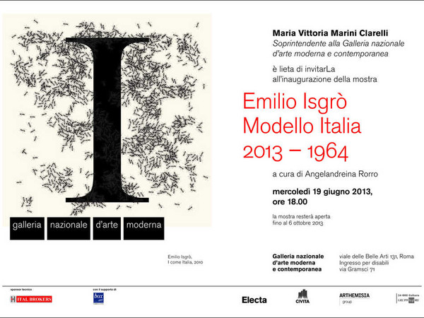 La mostra Emilio Isgrò. Modello Italia (2013 – 1964) a cura di Angelandreina Rorro si inaugura il 19 giugno 2013 presso la Galleria Nazionale d’Arte Moderna.