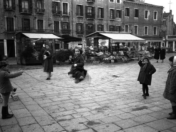 Gianni Berengo Gardin, Venezia 1958 - Campo Santa Margherita: bambini giocano al salto della corda, Collezione della Fondazione di Venezia, courtesy © Archivio Gianni Berengo Gardin