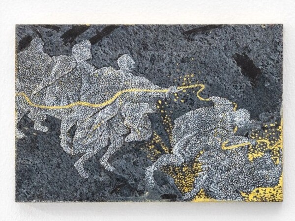 Giulio Malinverni, La Parabola dei ciechi, 2024, olio e foglia oro su marmo grigio ferro, 20x30 cm.