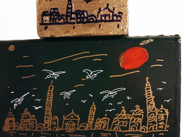 Saranno esposte 25 vedute di Venezia dipinte su vecchie ante di legno trovate in giro per la città che l’artista ha rielaborato conferendo loro una nuova vita. La città lagunare perde la sua classica immagine da cartolina e si trasforma in un mondo giocoso, popolato di gabbiani, palle di sole infuocate, navi tra i flutti di una laguna notturna. La sua Venezia si stende come una skyline lungo le assi allungate e strette. Il fondo oro del cielo è un rimando alla matrice bizantina della città così come di alcune delle tavole di Antonio Vivarini o dei trecenteschi veneziani.