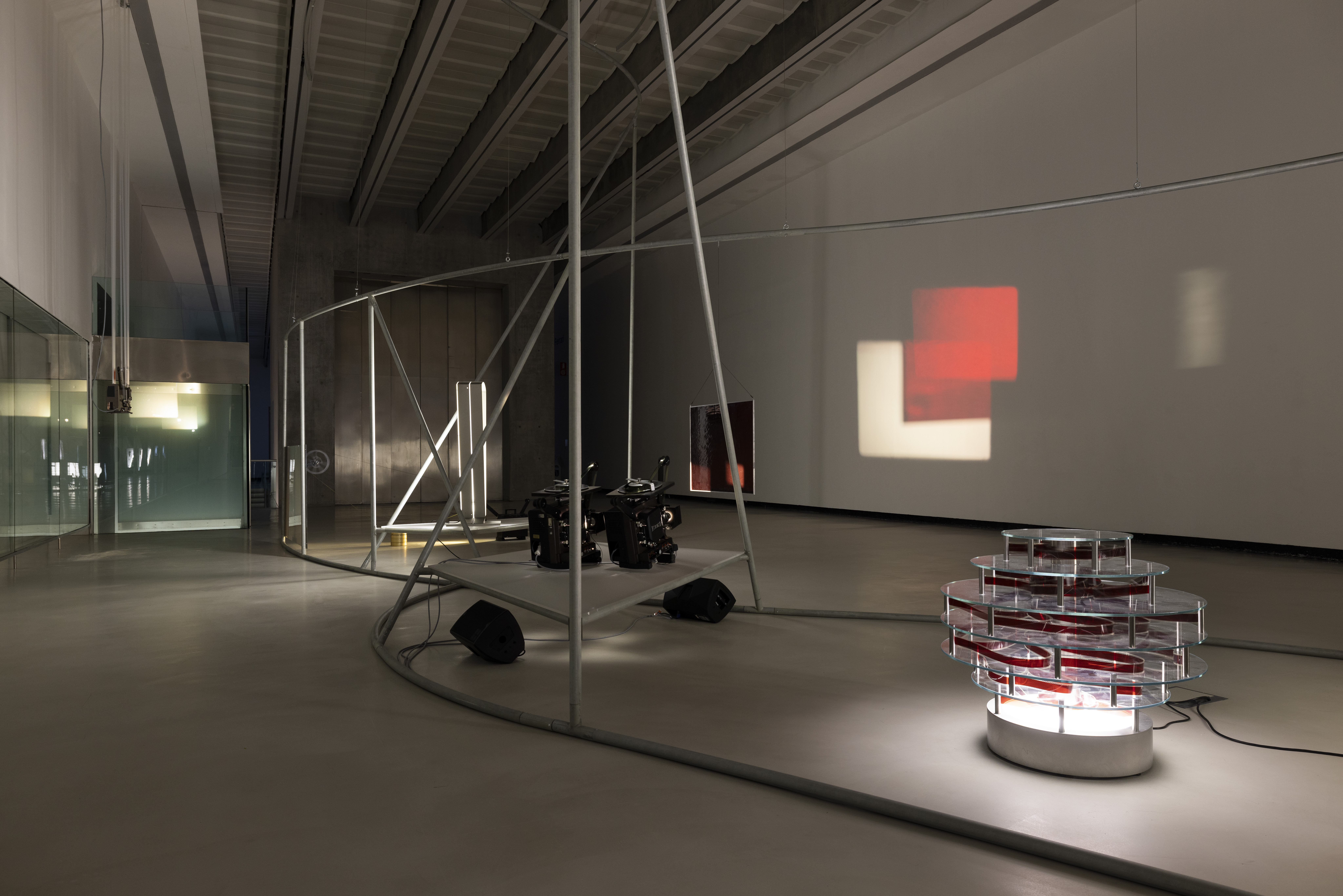 La ricerca di Rosa Barba, il cui lavoro prende le mosse da una ricerca storica e socioculturale per proporre una visione puntuale sul presente, si muove a cavallo tra cinema, letteratura e scienza, passando in rassegna il tempo come materia fisica e concettuale. Concepito come un pentagramma tridimensionale, sensibile all’architettura dello spazio ed esposta su binari intrecciati, l’allestimento si configura come un’imponente struttura in acciaio e plexiglass che accoglie 24 opere dal 2009 al 2025, in un percorso libero con tre diversi punti di accesso. Il tempo diventa un flusso circolare fatto di luce e ritmo, mentre il suono enfatizza la dimensione sinestetica della mostra. Cuore del progetto sono due nuove produzioni. Co-commissionato dal MAXXI con CAM – Centro de Arte Moderna Gulbenkian e coprodotto da Fondazione In Between Art Film e Hamburger Kunsthalle, Myth and Mercury (2025) è un nuovo film in 35 mm. Prendendo spunto dai Quaderni del carcere di Gramsci, Barba guarda al Mediterraneo come un’idea in continua trasformazione. They Are Taking All My Letters (2025) invece è una scultura cinetica composta da acciaio, acrilico, alluminio, LED, motori e 34 strisce verticali di pellicola in celluloide da 70 mm in costante movimento, con parole stampate tratte da testi di Susan Howe, Charles Olson, Robert Creeley e dell’artista stessa. Le frasi, in continua trasformazione, generano combinazioni linguistiche sempre nuove, che tessono una riflessione sul tempo, sulla luce intermittente e sulla traduzione del linguaggio in immagine.