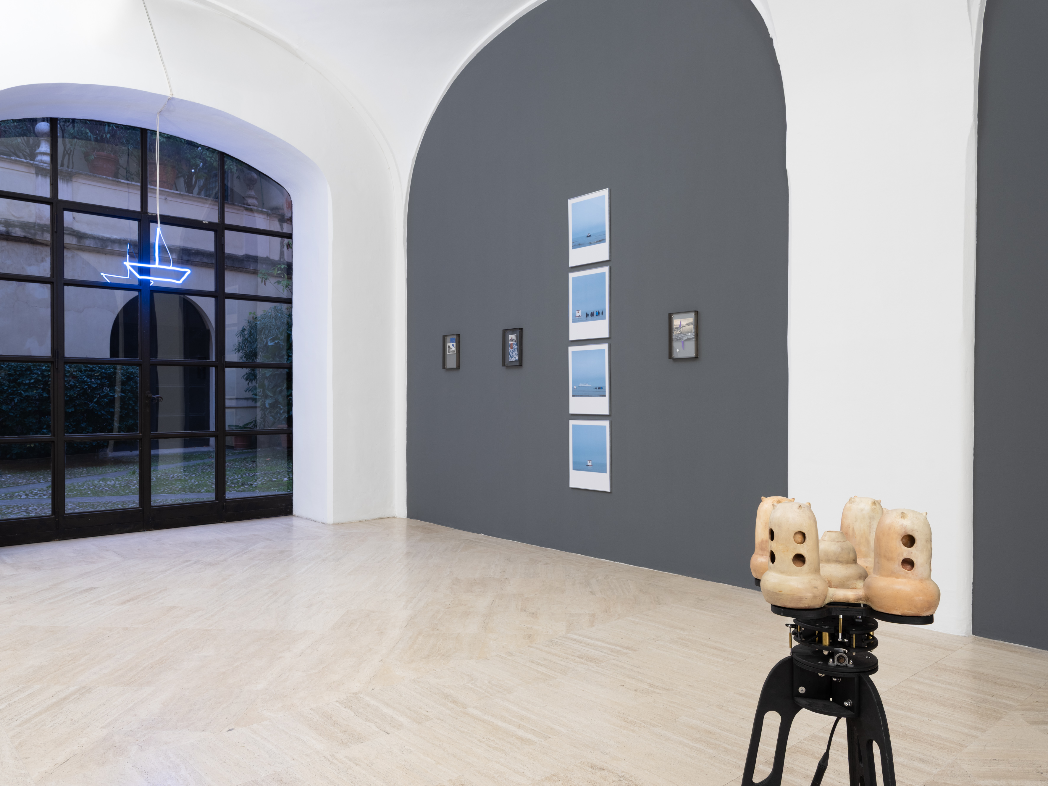 Assumption of Distinct Qualities (2025), composta da una pietra che sembra animarsi dall’interno, mentre un ramo di legno cresce organicamente scavandola e attraversandola. In un altro intervento per misurare e visualizzare idealmente il tempo, Kwade utilizza lancette di orologio in ottone. Se Paul Maheke per la mostra ha realizzato una nuova installazione site-specific che attinge all’iconografia funeraria conservata negli archivi, nei cimiteri romani per evocare una coreografia di fantasmi in cui passato e presente si intrecciano, l’artista cileno Enrique Ramírez ha costruito narrazioni stratificate incentrate sul mare, luogo di proiezione narrativa in cui il destino del Cile si intreccia con più ampie storie di viaggi, conquiste e migrazioni. L’allestimento abbraccia un ampio spettro di tecniche e materiali, dalla fotografia al collage, dalle installazioni luminose al suono.