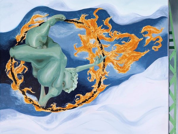 A common thread that runs through his body of work is the intriguing and oxymoronic relationship between tragedy and humour, as his characters find themselves in the midst of catastrophic situations or they are a symbol themselves for disorder. His paintings are deep explorations of the relationship between space, dimension, movement and volume within narrative frameworks.