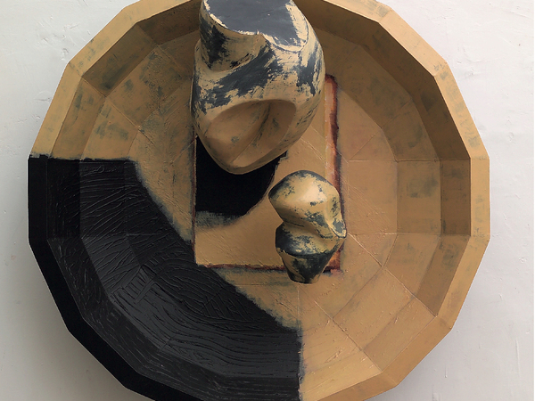 La prima opera che il visitatore incontrerà all’interno del Padiglione è la grande installazione Senza titolo del 1999 che mima una nicchia architettonica al centro della quale si stacca una forma ovale di pierfrancescana memoria. Di fronte a questo lavoro in legno, cartone e tempere, troviamo l’acrilico su Pet Tra giorno, notte, cielo e terra del 2025-2026, scelto per rappresentare gli esiti più recenti di una ricerca che, iniziata più di quindici anni fa, vede la figura – per lo più umana e debitrice dei volumi dell’arte manierista – smaterializzarsi lungo la prospettiva di piani trasparenti che scalano in profondità.