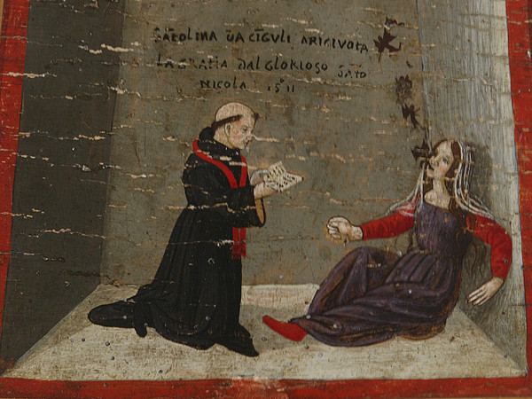 Carolina Da Ciguli arcivota la gratia dal Glorioso Sato Nicola 1511, Marche, Tolentino, Basilica di San Nicola, Olio su tavola, 24 x 20 cm | L’esorcismo avviene tra le mura di una cella d’isolamento. La donna accasciata a terra, stringendo in mano il rosario, si libera dal male, facendo uscire dalla bocca quattro diavoletti neri, il primo della fila ha una bandierina in mano