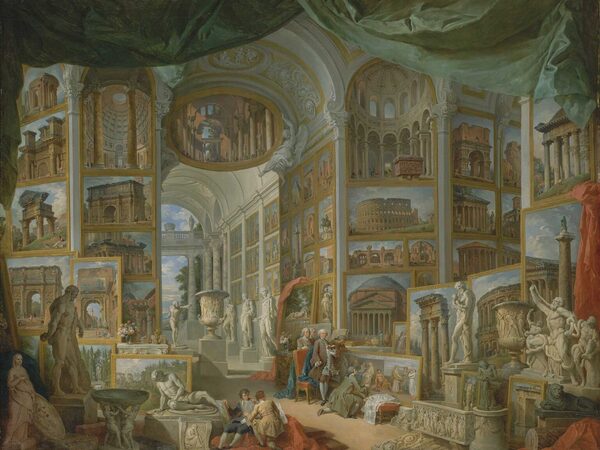 L’opera in arrivo dal MET risale al 1757 ed è uno dei più celebri esempi di ‘metapittura’ in cui il pittore inventa una sontuosa galleria immaginaria in cui sono esposti più di cinquanta suoi dipinti e vedute di rovine della Roma Antica, il genere che lo aveva reso famoso. La scena è popolata anche da statue e monumenti dell’antichità, tutte riconoscibili, in cui si muovono diversi personaggi, tra cui l’artista stesso e il committente del dipinto, il conte di Stainville, ambasciatore francese a Roma in quegli anni.