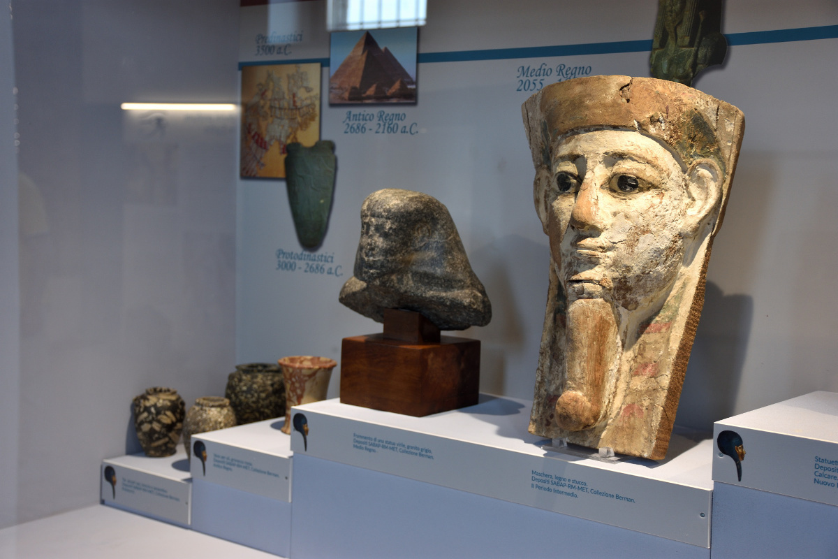Maschere e amuleti apotropaici, vasi da banchetto e contenitori per essenze, oggetti inediti, come la mummia di una bambina di circa sette anni, con...