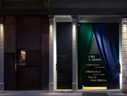 Tu sei il segno, la vera frontiera del mio amore. Creazione del mio mondo, della mia poesia, è il testo scelto per BUILDING BOX, che spicca da un fondo nero e verde i cui versi inducono a letture multiple sull'amore, sulle relazioni interpersonali e sulla soglia. Ma, a ben vedere, non sono altro che le trame e gli intrecci di un tessuto che si determina sotto l'aspetto tattile e ugualmente mentale.