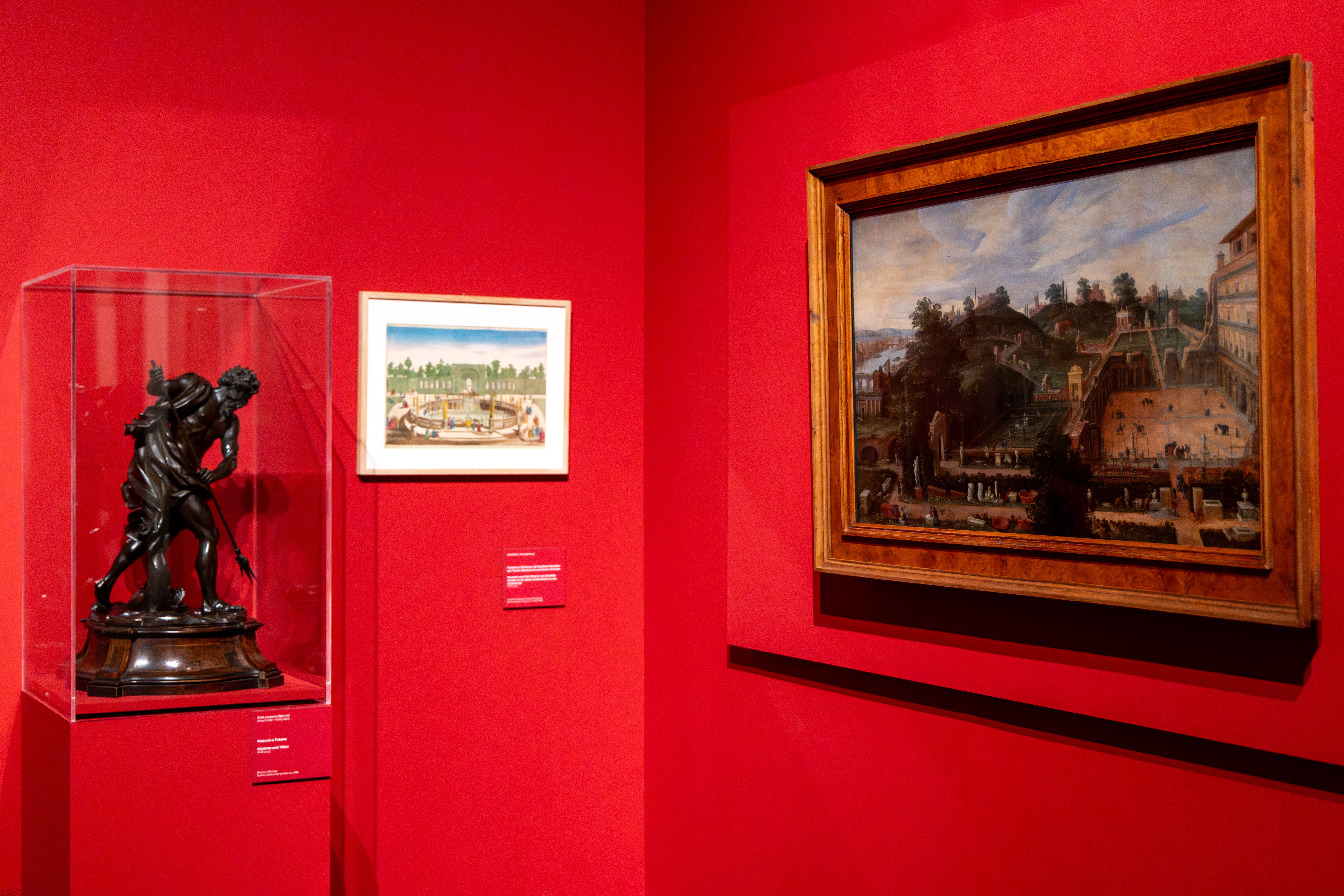 Villa Madama, Villa Giulia, il Belvedere vaticano, La Farnesina, Villa Medici sono documentati in mostra da opere di celebri artisti quali Hendrick van Cleve, Caspar van Wittel, Paolo Anesi. Queste creazioni lasciano spazio alle Ville del Seicento e ai loro lussureggianti giardini impreziositi da scenografiche fontane, frutto dell’estro dei migliori artisti e architetti del tempo come Flaminio Ponzio, Carlo Maderno, Giovanni Vasanzio, Alessandro Algardi, Pietro da Cortona. Un esempio tra tutti Villa Borghese, immortalata dal dipinto di Joseph Heintz il Giovane.